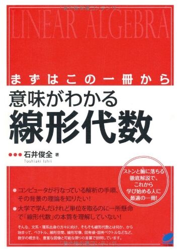 スラムドッグ$ミリオネアを見た 「アメリカの本当の姿を見せてあげるわ!」って言いながらアメリカ人が財布から金を出すシーンが一番良かった。 線形代数 まずはこの一冊から 意味がわかる線形代数 (BERET SCIENCE)作者: 石井俊全出版社/メーカー: ベレ出版…